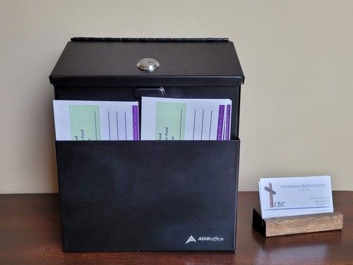 Below is a picture of our offering box. You will notice that there are envelopes available at the front of the box. The envelopes are provided for those giving cash. These only need to be used for 2 purposes: